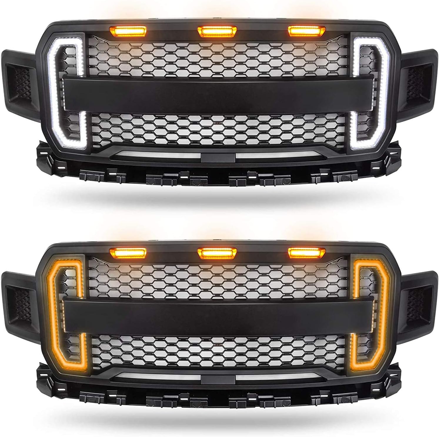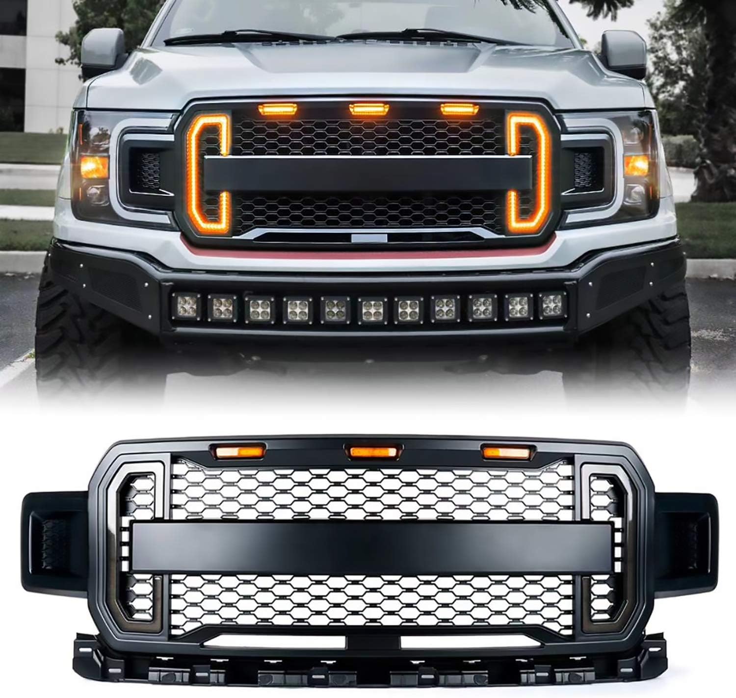 - ✬Package: Front Grille+ 3 Amber LED Lights+ DRL Turn Signal Lights+ Wire Harness.